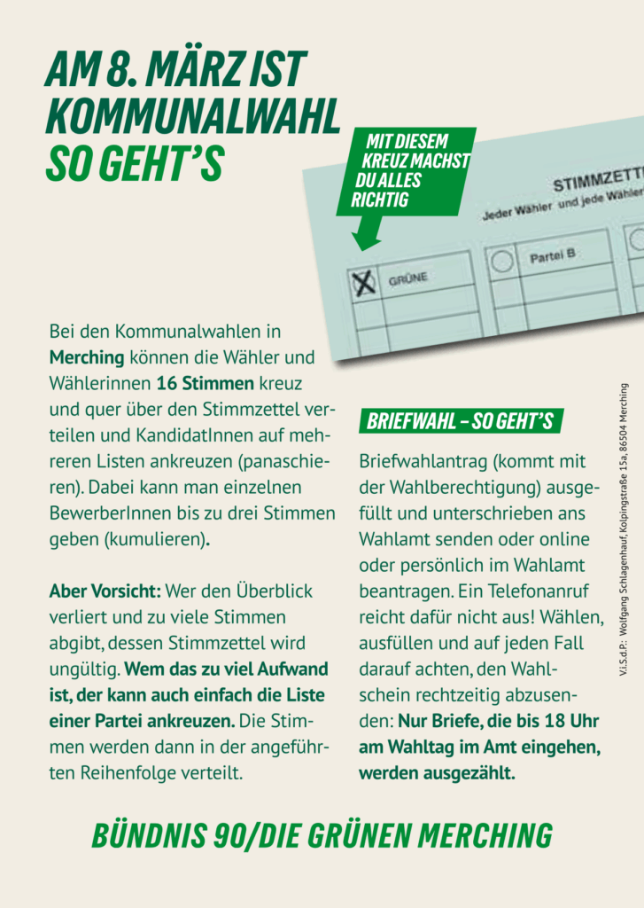 Merching ist unser aller Heimat – mit vielen Vereinen und sozialen Gruppen, mit gut geführten Bildungseinrichtungen, regionalen naturnahen Freizeitangeboten. Wir GRÜNE machen uns dafür stark, dass unsere Gemeinde noch attraktiver wird und alle Menschen im Ort diese Vorzüge genießen können.